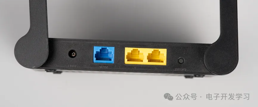 这个产品它有一个WAN口(蓝色)和两个LAN口(黄色),这几个有线网口的速度都是100M的。