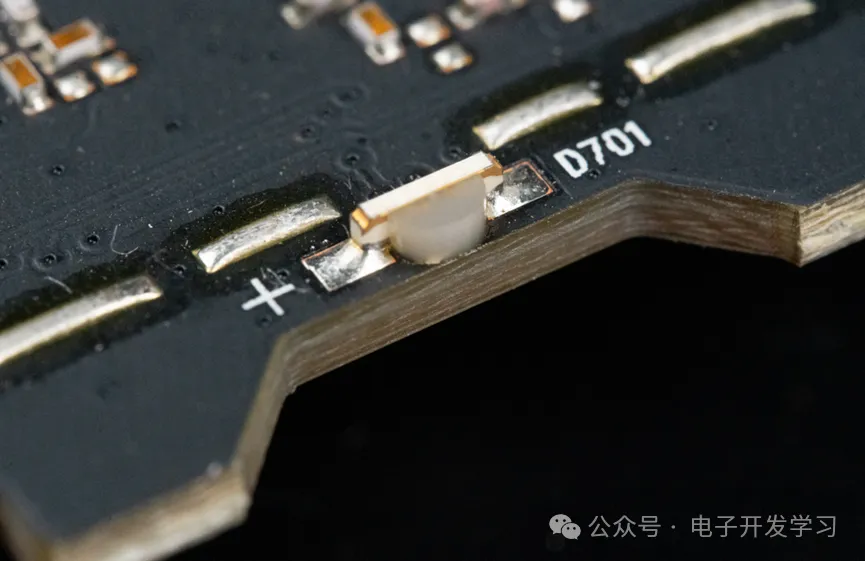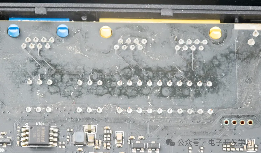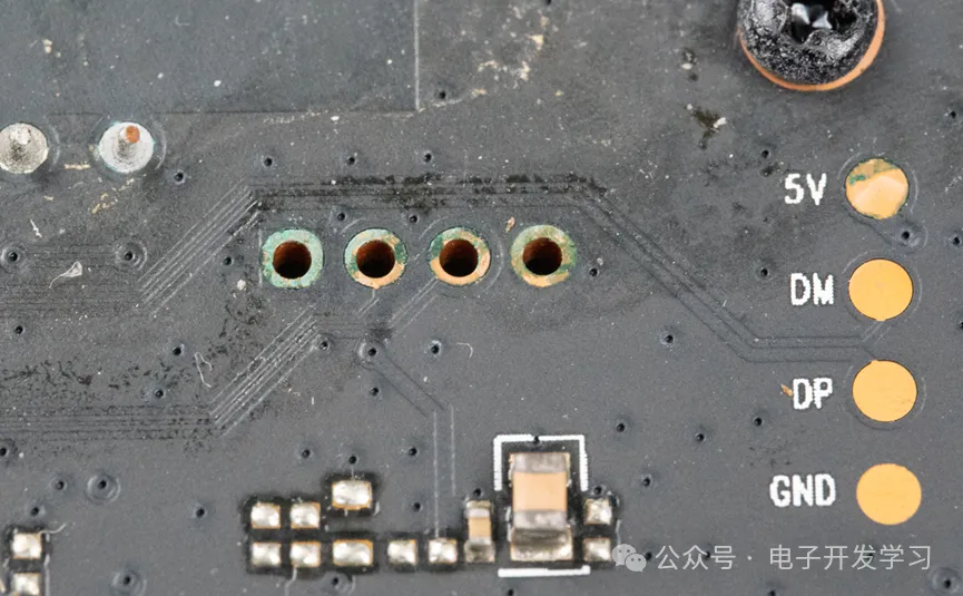 我留意到板子上的四个过孔都出现铜绿了,这不出意外是焊接之后未清洗助焊剂,导致板子腐蚀所致。