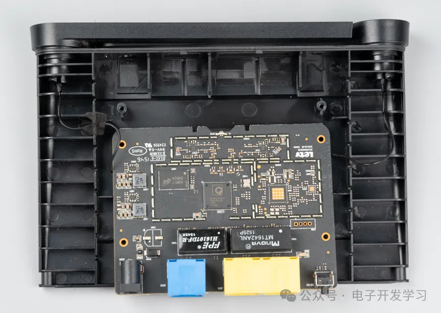 内衬反过来一看电路板通过四个螺丝固定在它上面。这电路板背面看着挺脏的,尤其是以太网连接器和天线焊接点这里。