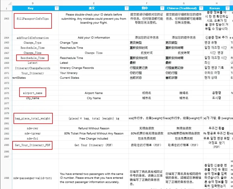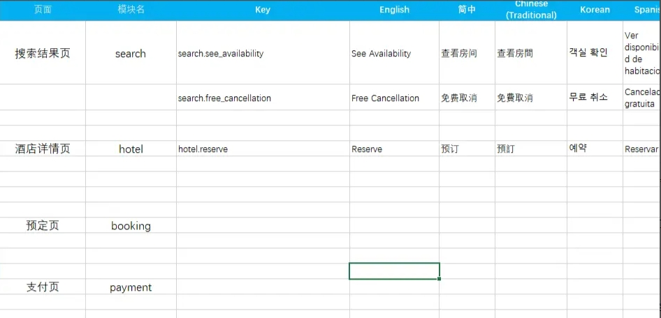 目前机票项目分为 H5 和 PC 两端,团队在维护多语言时主要通过在线 Excel进行管理: