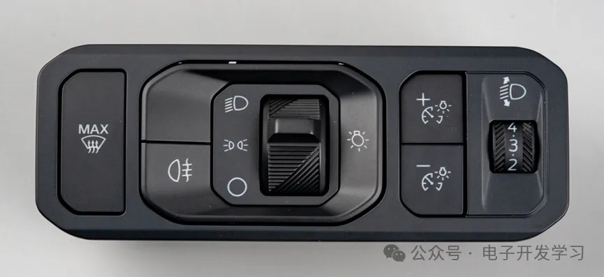 模组上从左往右依次是除雾,后雾灯,大灯开关(三个挡位分别是前照灯、示宽灯、车灯关闭),以及大灯亮度调节和大灯光束角度调节。
