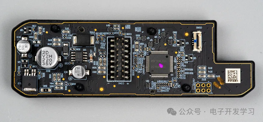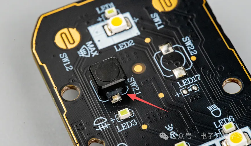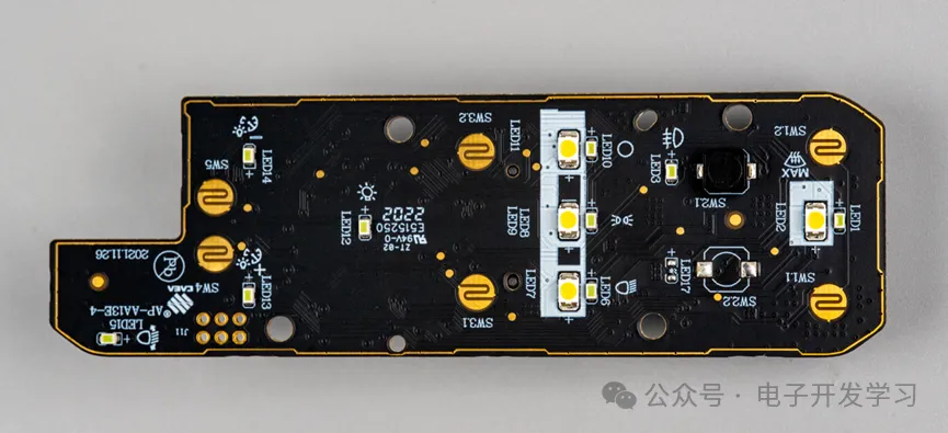 电路板背面同样镶了一圈金边,而且这个金边并不是老老实实沿着板子边缘走一圈,还凹了几个造型,看起来挺有科技感。这一面就是PCB板载按键和LED指示灯。
