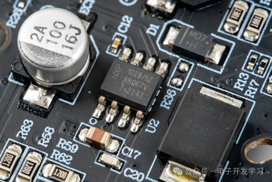 LIN总线收发器采用的是NXP的TJA1028T,是一款符合LIN 2.0/2.1/SAE J2602和ISO 17987-4:2016 (12 V)标准的车规级收发器,集成了低压降稳压器,采用SOP-8封装。所以这个开关模组和整车的通信显然也是LIN总线。