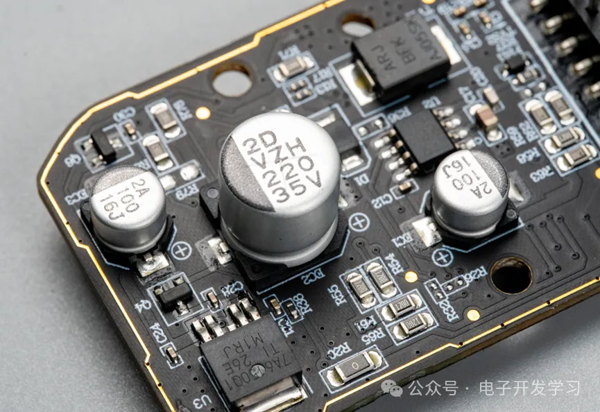 板子的电源侧有三颗铝电解电容,分别是两颗100uF16V和一颗220uF35V。