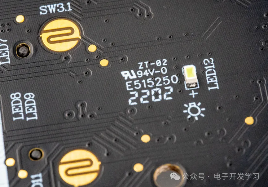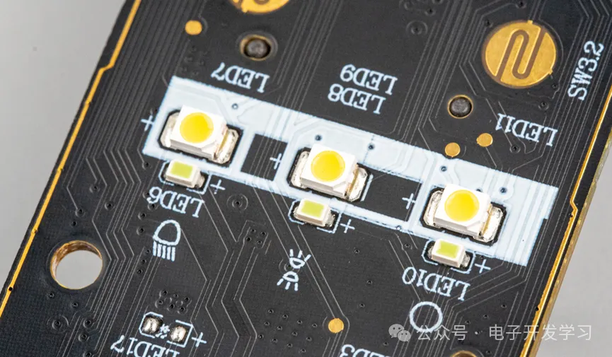 一般情况下LED灯板会做成白色阻焊。但是这个板子是黑色的,所以他们在灯周围加了一圈白色丝印。
