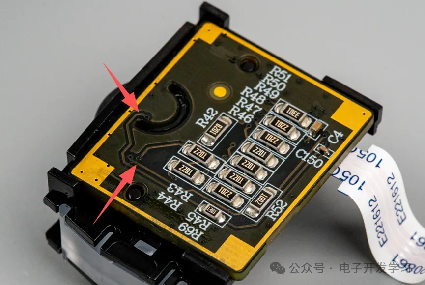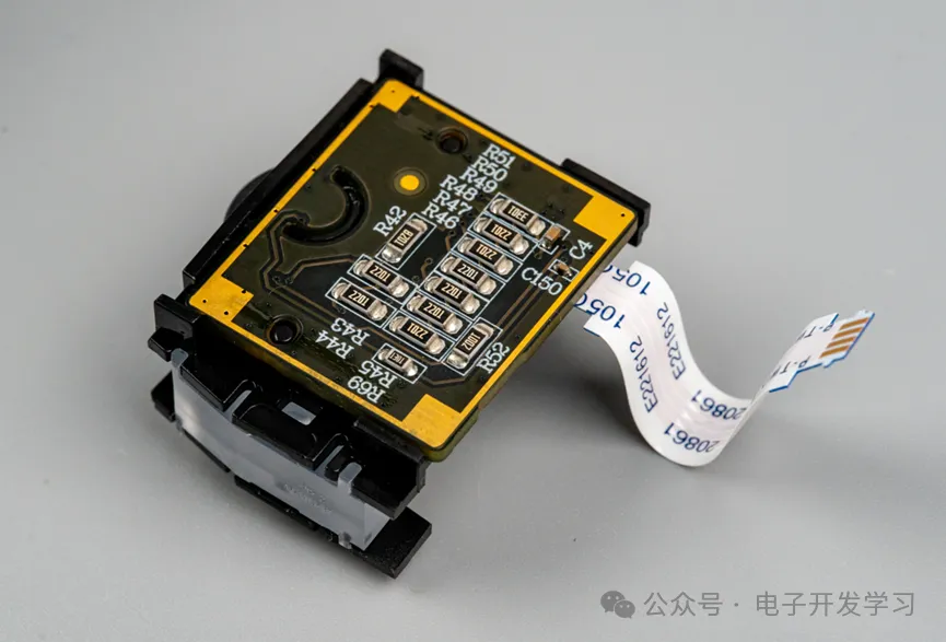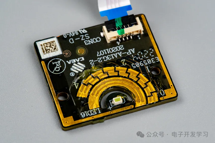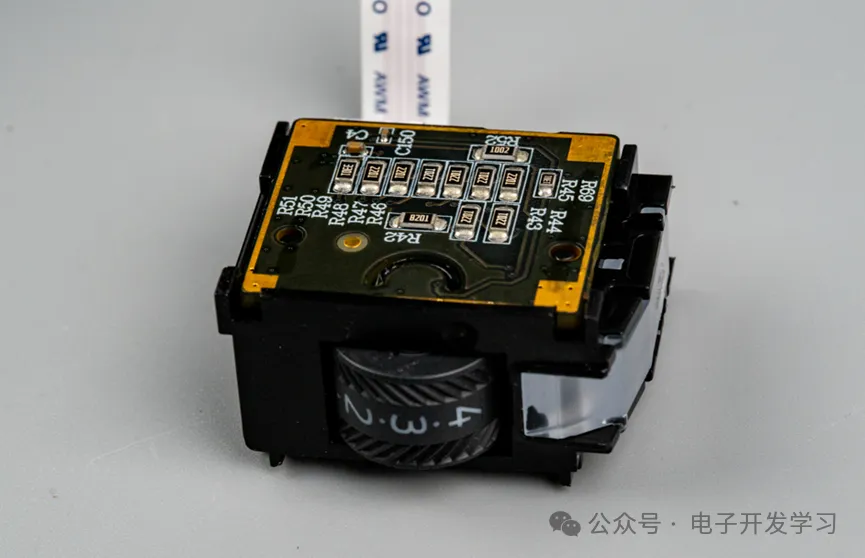 相应的,这是电路板,看起来电刷和电路板上的类似编码器的焊盘是接触的。当滚轮转动时,接触的位置不通,从而导致短接的电阻不通。