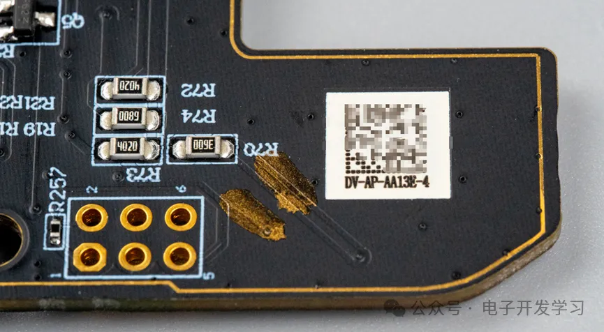 电路板的一角留了一个正方形的丝印,后期生产时在这个丝印上打了二维码。使用这种方式来对PCBA产品进行溯源是个不错的选择。