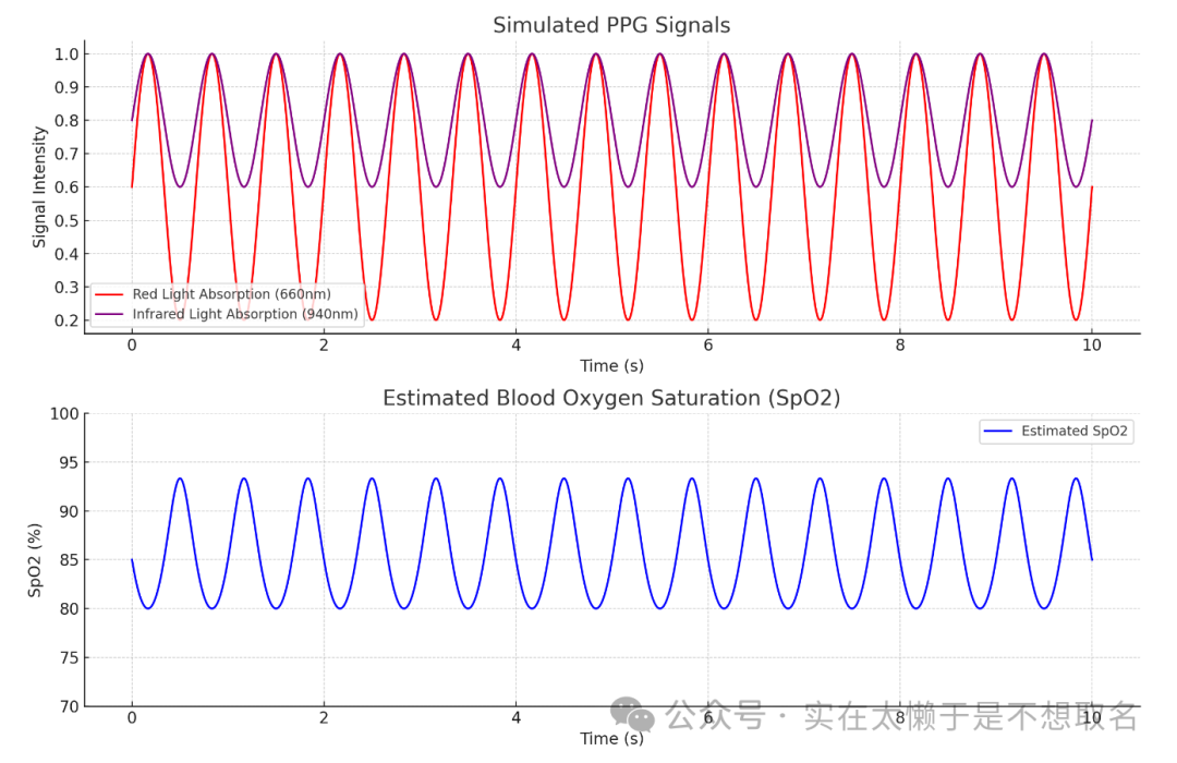 - 下图:基于红光和红外光吸收信号的比值,计算得到的血氧饱和度(SpO2)。在这个简化模型中,SpO2大约在95%到100%之间波动,显示了随着时间的变化估算的血氧水平。