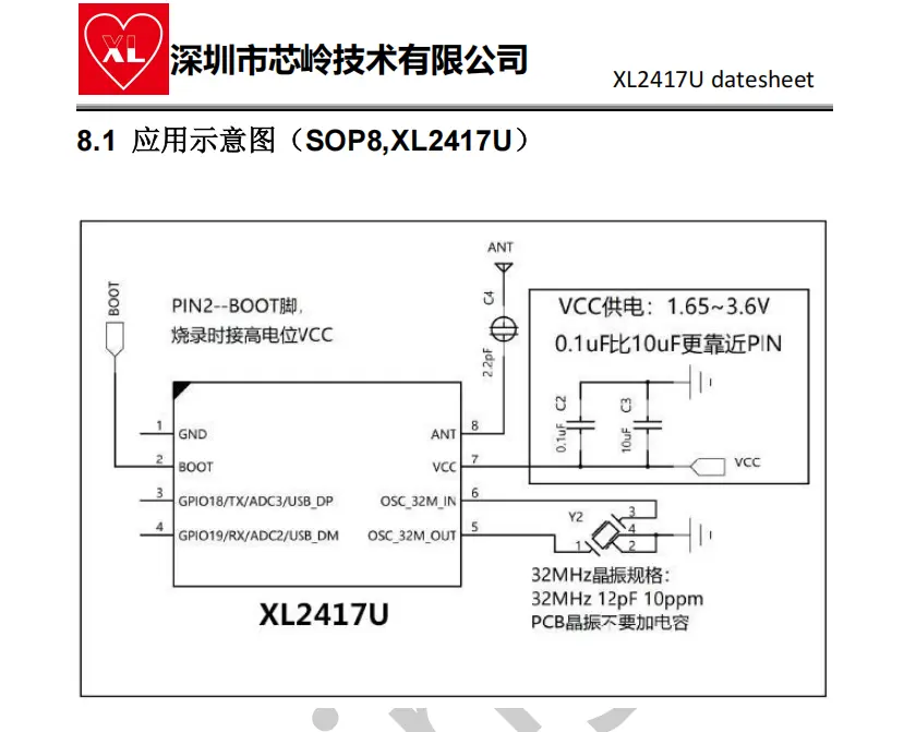 XL2417U芯片是一款低功耗、高性能和高度集成的SoC,带有2.4G收发器。它集成了高性能2.4GHz射频收发器、丰富的基带功能、32位MCU和各种外围IO。它支持128KB的flash和48KB的RAM,以实现可编程协议和配置文件,支持定制应用程序。XL2417U的工作电压范围为1.7至3.6V