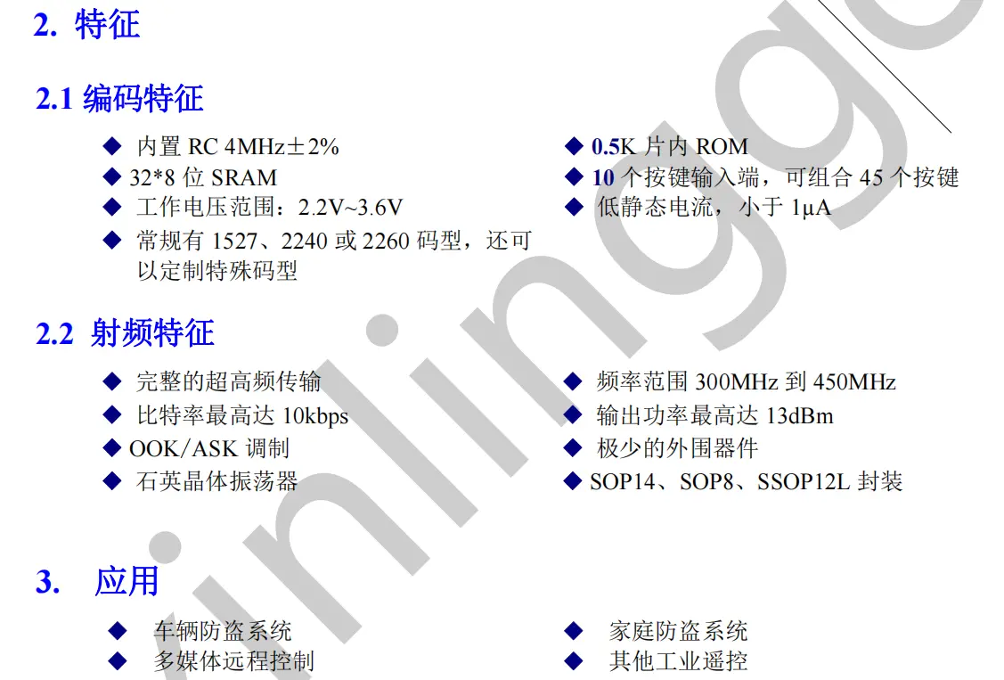 芯片内部包含可编程存储器,可以提供给用户一个方便的开发和检验他们程序的环境。用户可以根据自己需要来确定不同的编码,常用有 1527、2240 和 2260。