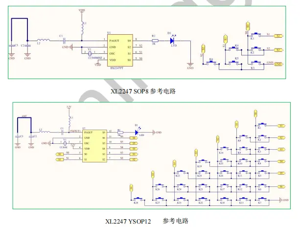 XL2247是一款低成本、高速度、高抗干扰,带射频传输的专用编码芯片。工作电压 2.2~3.6V之间,工作温度范围在-20℃~70℃之间。芯片应用带宽在 300~450MHz 之间,在传输功率、工作电压和工作温度方面有着显著的优点。