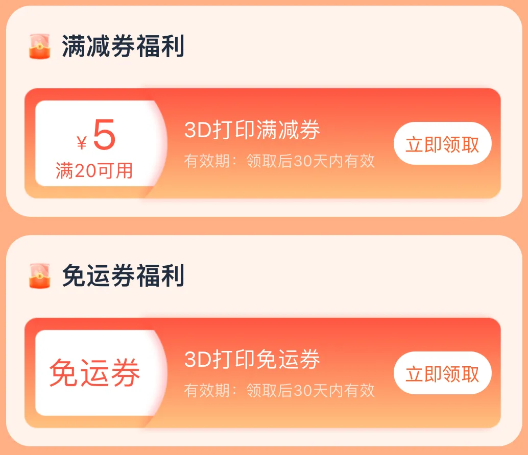 ①3D打印满20-5优惠券(小零件打印满额立减)