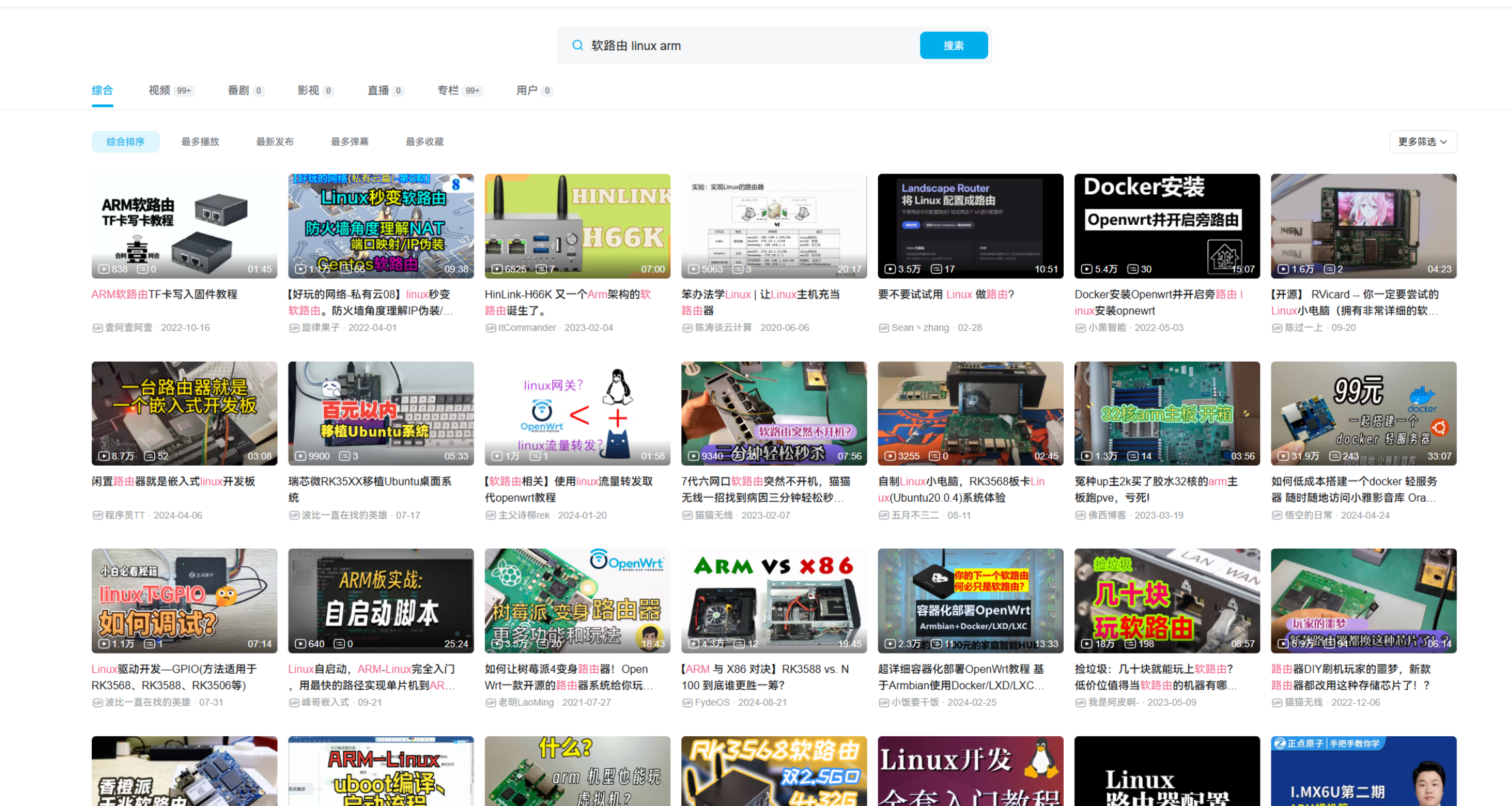 首先就是去寻找别人的产品上用了哪些方案,对于我们小白来说,先学会抄,往往能节省大量的精力和时间成本。以我们的软路由举例子,我们打开 B 站,搜索“软路由 linux arm”等字样,可以了解到市场上现在同类产品大概用的是什么方案,他们的方案在我们的设计中是否有可取之处?如下图所示