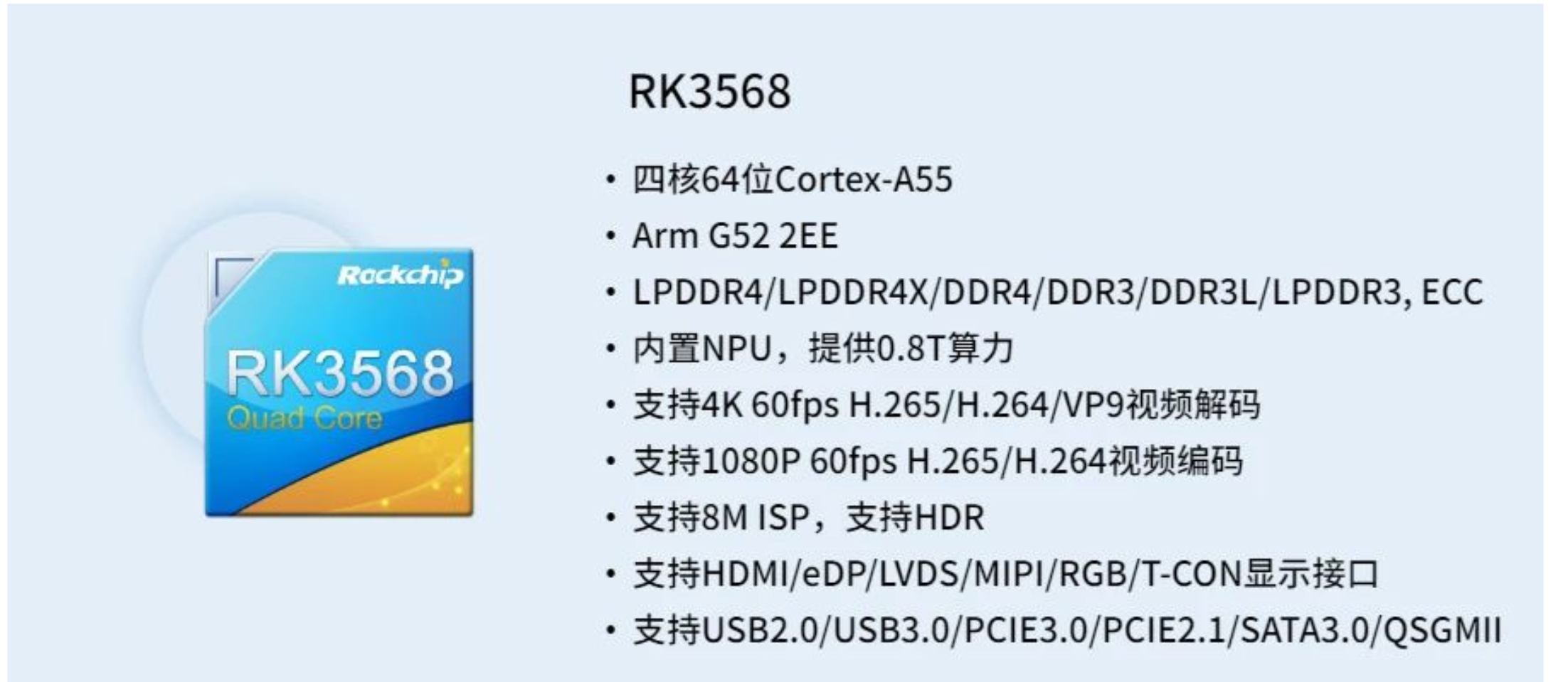 价格是重中之重,对于我们初学者来说,一下就上大几百块的 3588 万一失败很容易打击到我们,试错成本非常高。而 3568 这款芯片一套(CPU,内存,电源管理,emmc)只要 50 块钱,失败的代价没有那么高。购买渠道很简单,你选择的芯片是比较容易以一个很低的价格能在各个平台买得到。