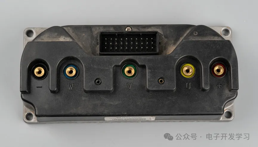 从正面看,连接电机的UVW相线和电源母线的连接器都是这种铜柱螺栓。螺栓外面还有不同的颜色用来区分。通信和控制接口是三排4.2mm间距的排针。
