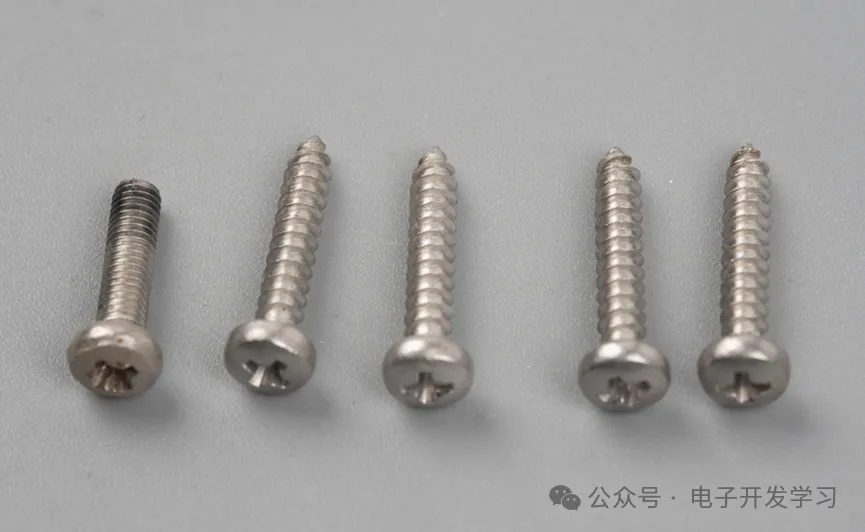 既然外壳看完了,顺便把螺丝也看一下,四颗螺丝是从铸铝打到ABS材质的,所以是自攻丝,而另外一个是从ABS顶壳打到铸铝底壳的,所以是这种标准M3螺丝。