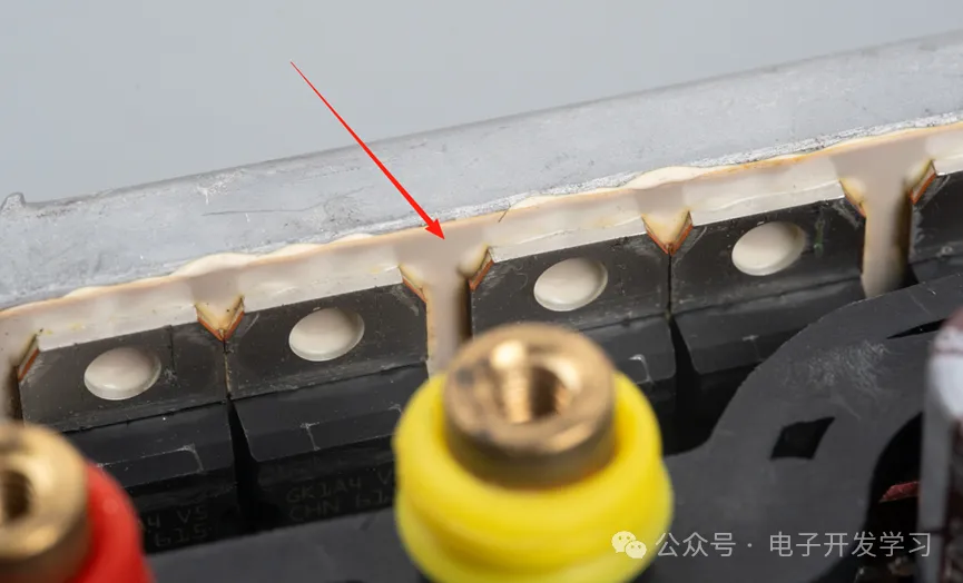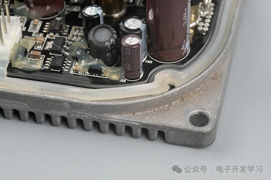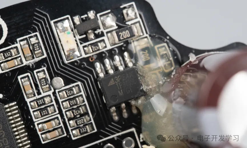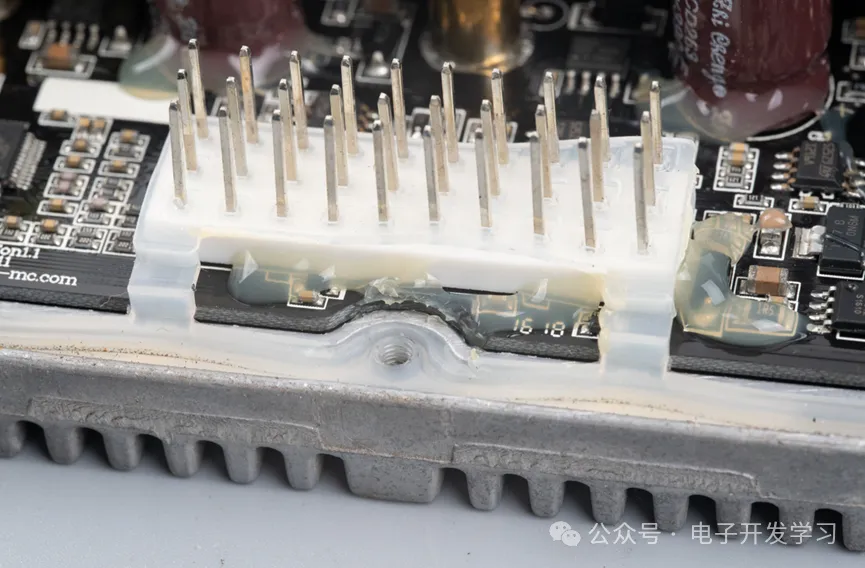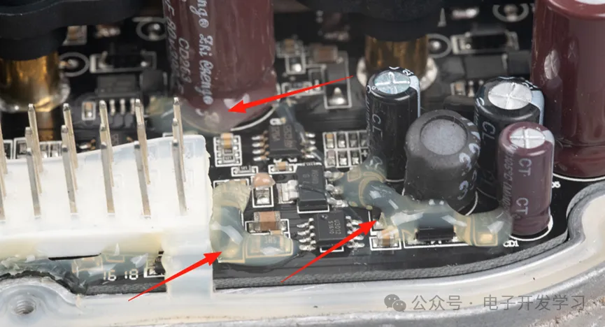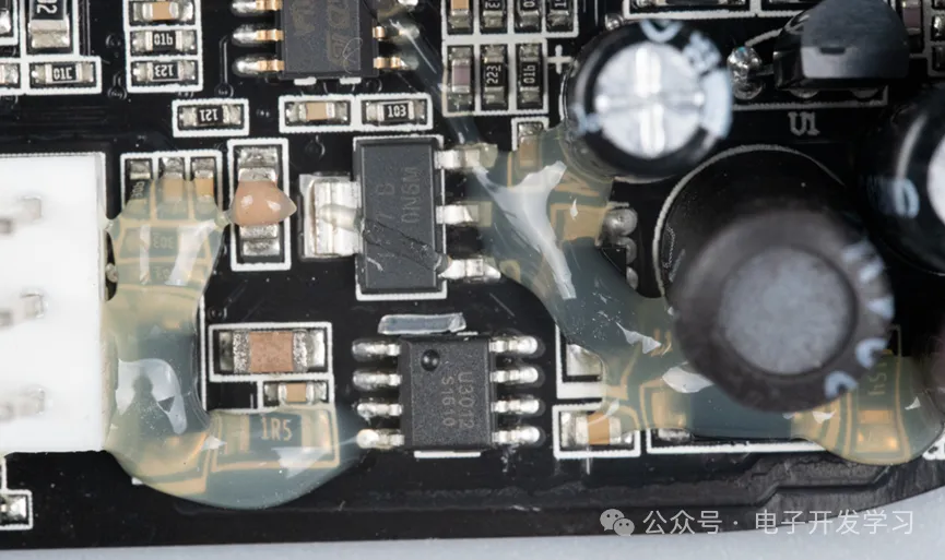 电路板上的大器件上,都点了硅橡胶用来加固。由于用的是半透明的硅橡胶,所以看起来有点像胶枪点的那种,但是实际上经过了9年,摸起来还是Q弹的,确认是硅橡胶无疑。