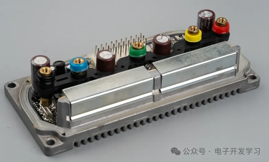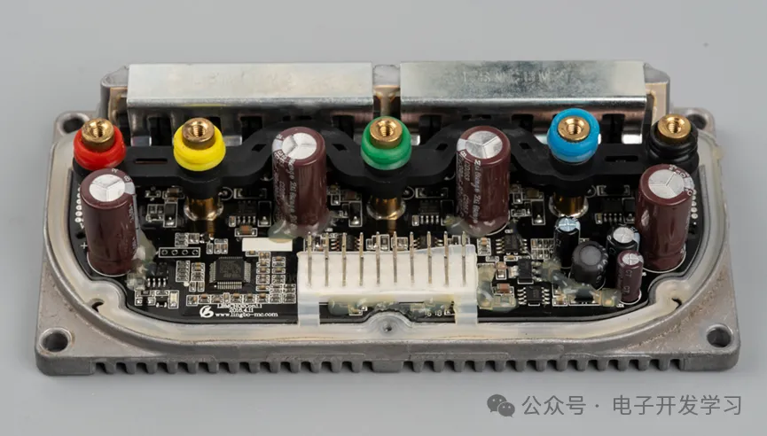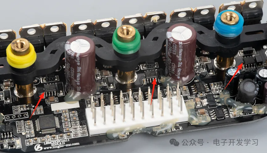 这个驱动器,电路板布局非常讲究。电源母线和电机相线连接铜柱、以及大电容、排针等大的物料几乎完全对称摆放,看着非常舒服。