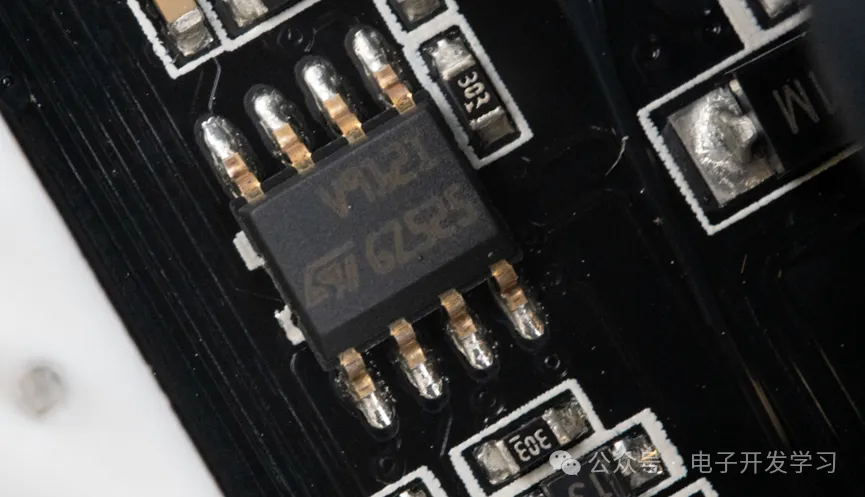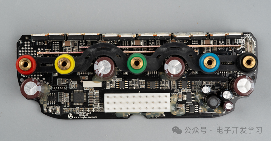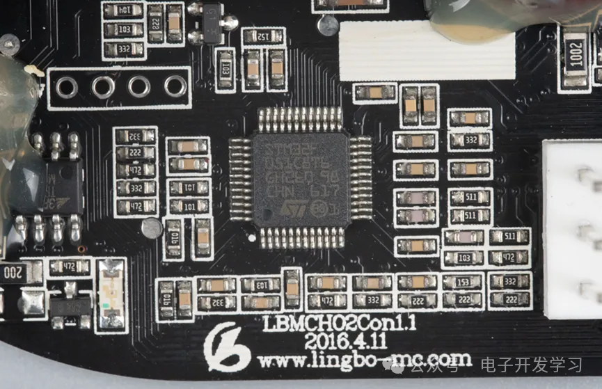 主控芯片用的也是ST的料,型号是STM32F051C8T6。周围这些阻容,看起来应该是采用了低成本的RC防护电路,布局看着非常工整舒服。从这里看到丝印2016.4.11,应该是这个板子的设计日期,而不是生产日期。生产批次在板子上没有找到。看底部的网址,应该是凌博给设计的没有疑问了。