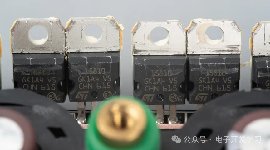 接下来看看电路板上的用料。首先,12颗MOS的型号全部是ST的STP15810,这是100V、110A、3.6毫欧的N沟道MOS管,封装为TO-220。这个电压和内阻级别的MOS,全新的价格应该在3元以上。要知道现在的厂商是如何压缩成本:为了做低成本的驱动器,甚至搞出了85V、75V这种奇葩电压等级的MOS,就是为了节省几分几厘的,当然,量大了节省下来的数字也确实不可小觑。