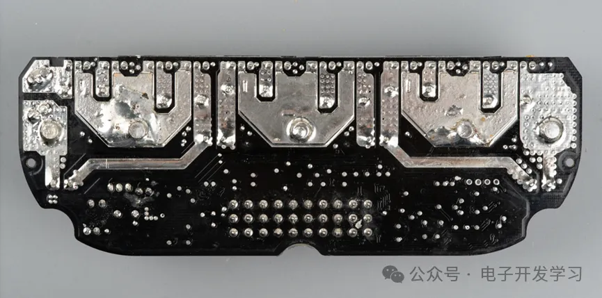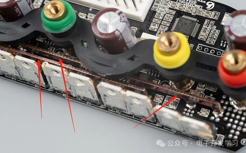 在MOS管驱动这一块,电源和地都是通过插焊在板子上的两个厚度1.2mm的铜排来传输的。