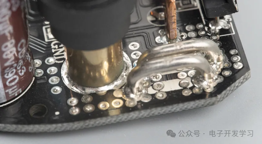 这个地方是电源负极处,所以用了很多过孔,而且过孔比较大,都灌锡了,这样可以进一步增加导流能力。