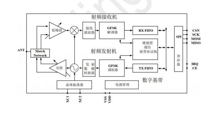 集成射频收发机、频率合成器、晶体振荡器、调制解调器等功能模块,外围仅需1颗晶振 + 3个电容即可工作。