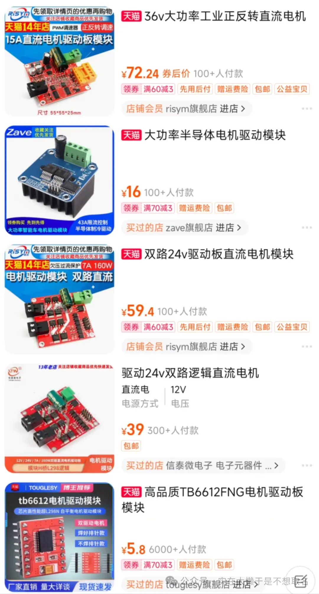 然而随着集成芯片的广泛使用,现在的大部分电机驱动也用集成芯片来控制。例如L298N,TB6662等等驱动芯片都被广泛的使用,不过在挑选的过程中也需要根据我们实际的使用电流来选择驱动型号。不然也会出现电流不够的情况。
