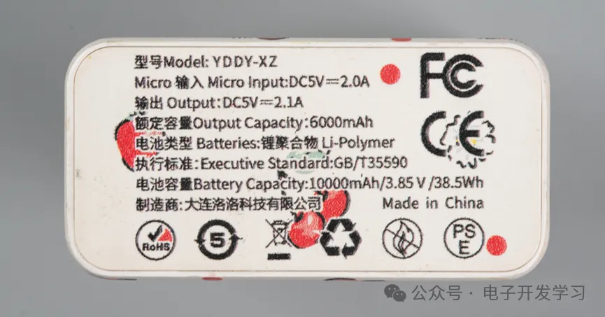 底部有参数。输出最大5V2.1A,容量是6000mAh。有FCC和CE认证。
