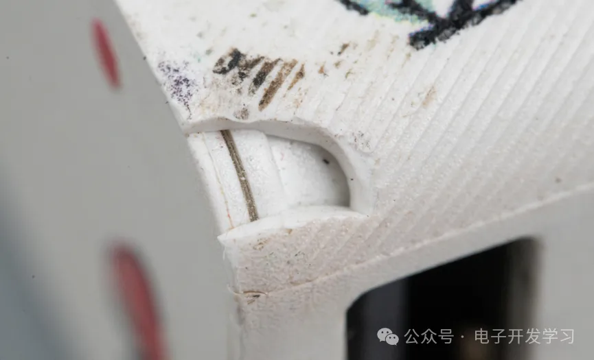 一个角有缺口,仔细观察发现有超声波焊接的痕迹。