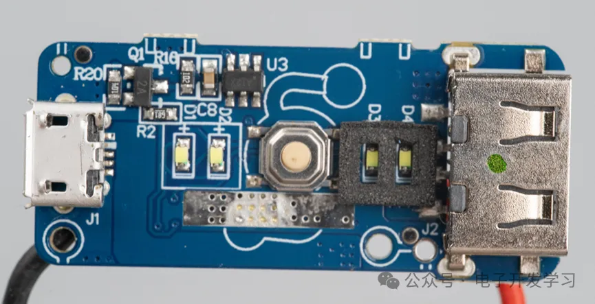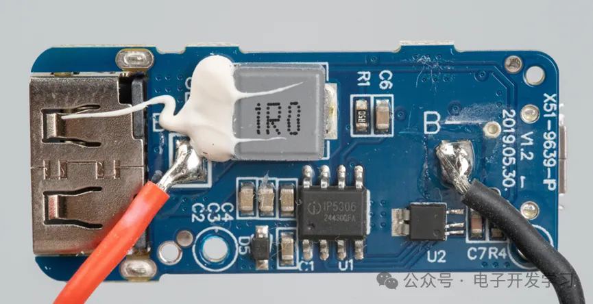 电路板很小巧。上面的芯片是英集芯的IP5306,这是一颗2.1A充电2.4A放电的高集成度的移动电源SOC。这颗芯片算是整个充电宝的大脑。