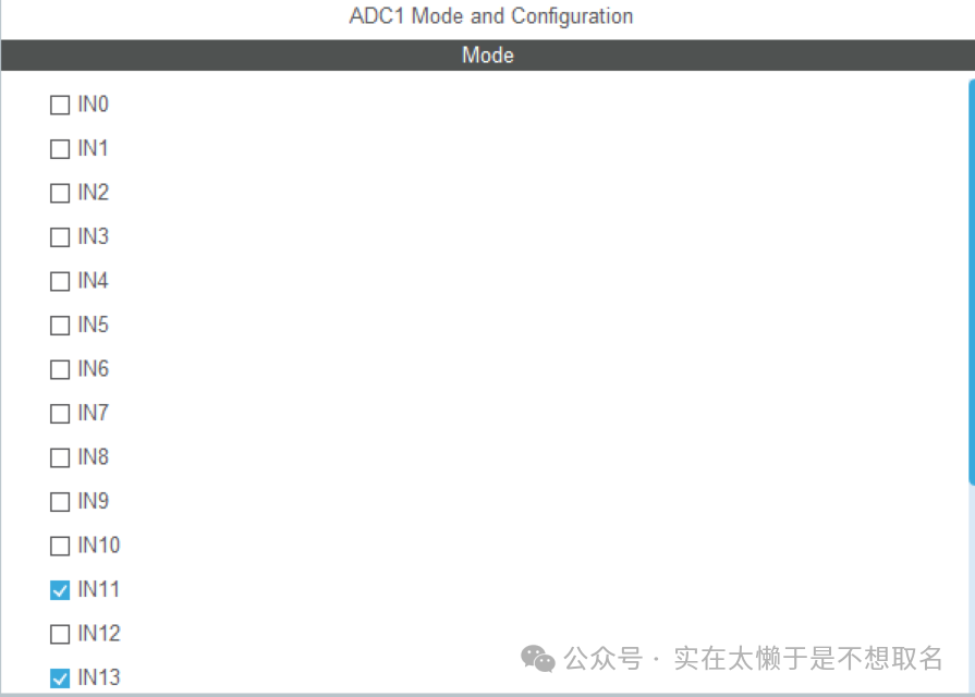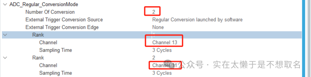 在下面的规则中规定我们的转换规则,这里我们是先测量Channel13再测量Channel11,我们调用HAL_ADC_GetValue的时候就会按照13->11->13->11.....的顺序获取我们的ADC的不同通道的值。