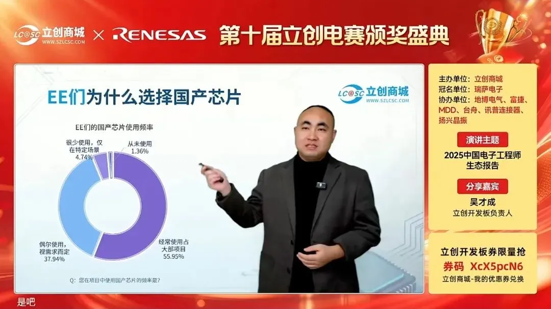 颁奖盛典现场,立创开发板负责人吴才成现场为观众带来了《2025中国电子工程师生态报告》的精彩分享。2025年中国电子工程师群体的薪资结构变化、元器件产品偏好,让现场观众直呼“意想不到”!