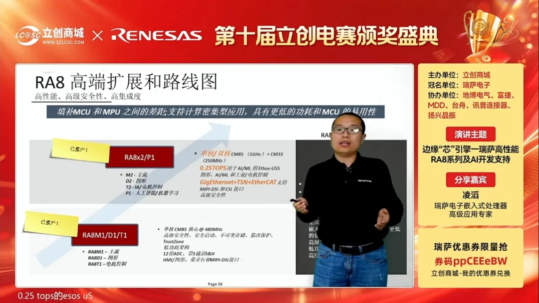 而瑞萨电子嵌入式处理器高级应用专家凌滔,则为我们带来了主题演讲《边缘“芯”引擎——瑞萨高性能RA8系列及AI开发支持》。凌工不仅为我们介绍了瑞萨的高性能新品,还让我们对瑞萨电子的技术理念与AI布局有了更深入的了解。