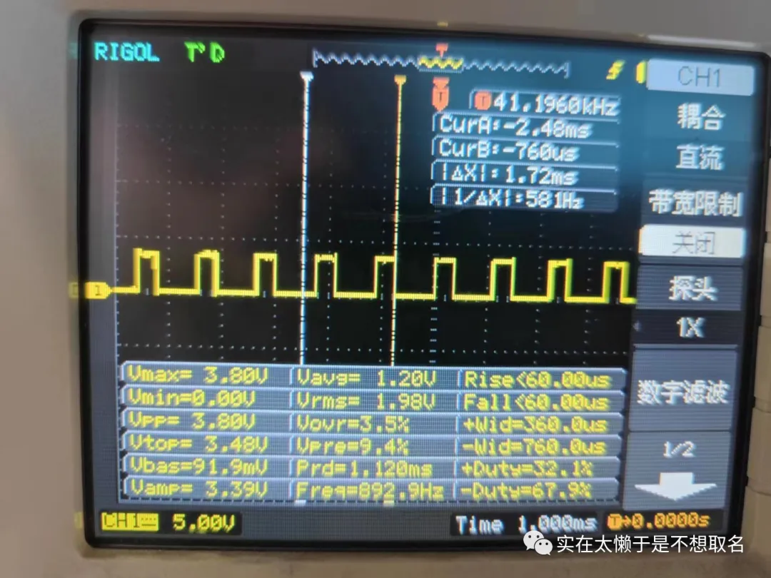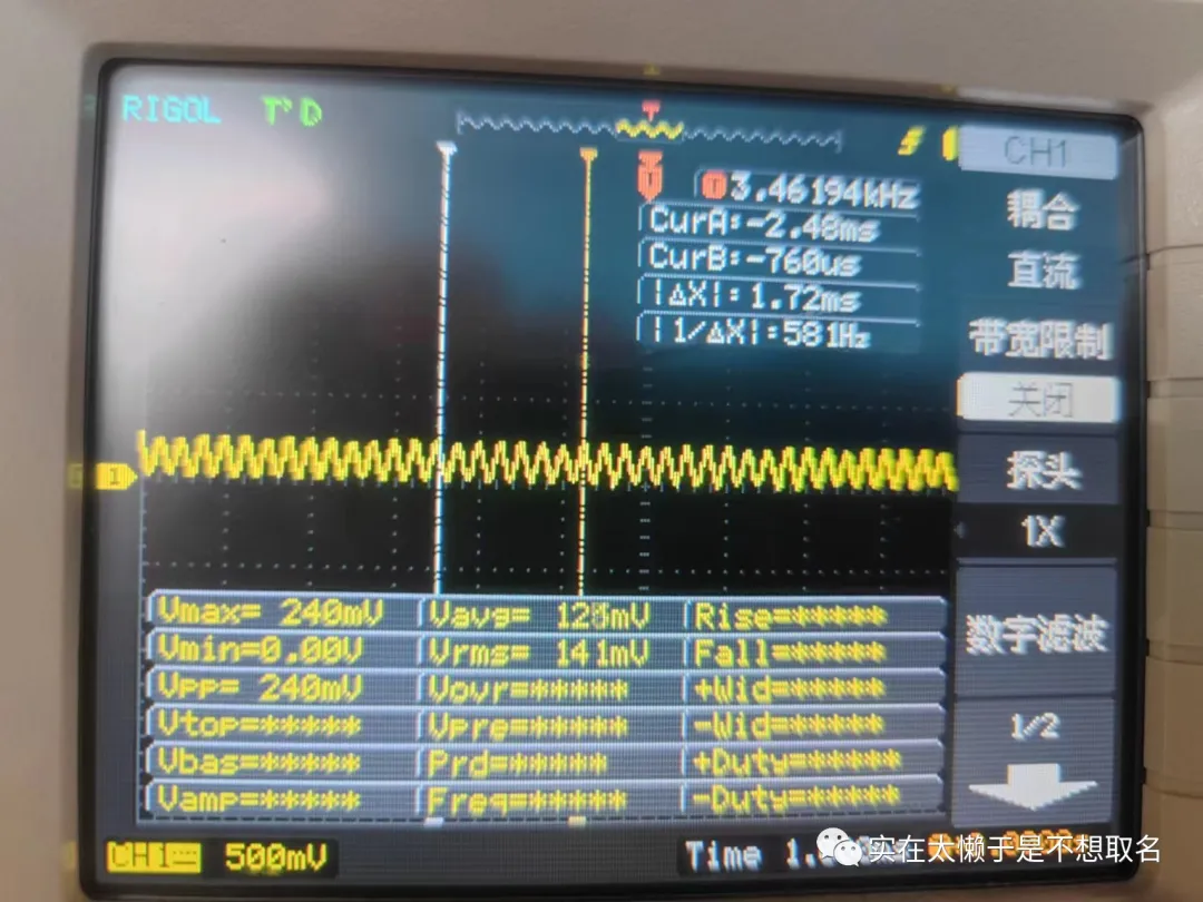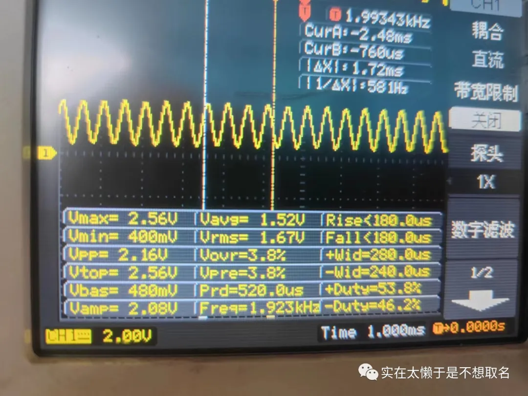 可以看到2KHZ的时候,有效值为1.67V,而1KZH时为2V,根据计算衰减约为0.83而-3DB衰减约为0.81,二者极为接近。