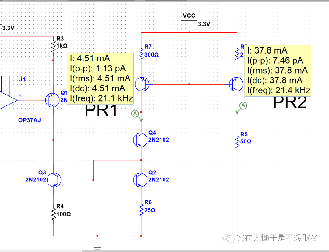 使用运放负反馈电路可以使得负载RL(R4)上有一个稳定的电流,根据运放虚短原理U+ = U- ,即流经R3的电流为(3.3-1.65)/ 1 = 1.65mA 三极管的发射极电流等于基极加上集电极电流之和,因此IE = (1+β) IC 二者电流近似相等。