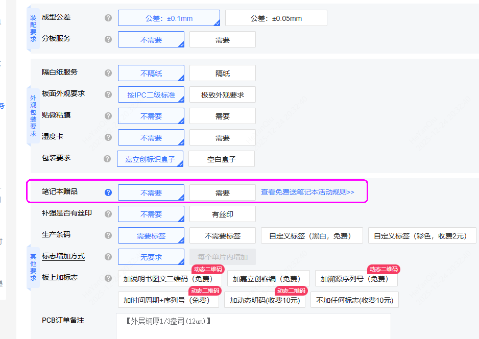 所有在嘉立创下单的客户,在提交订单时,系统都会弹出“是否需要笔记本赠品”的选择选项: