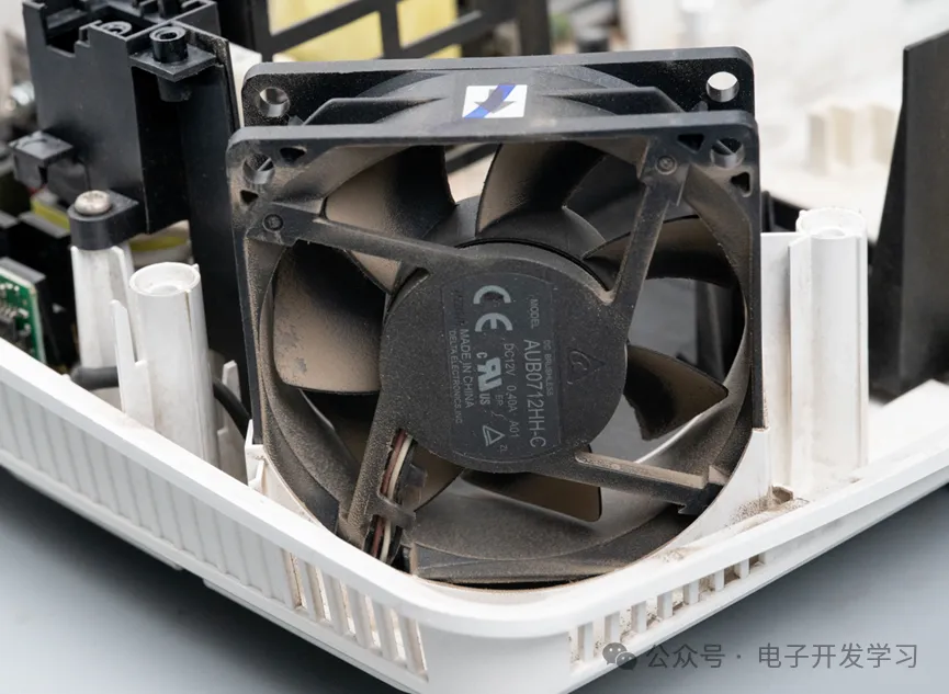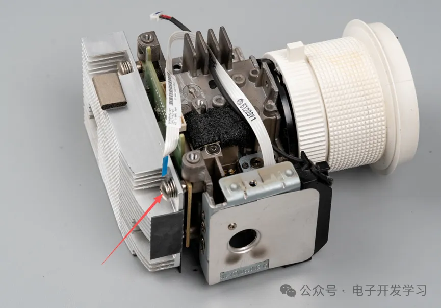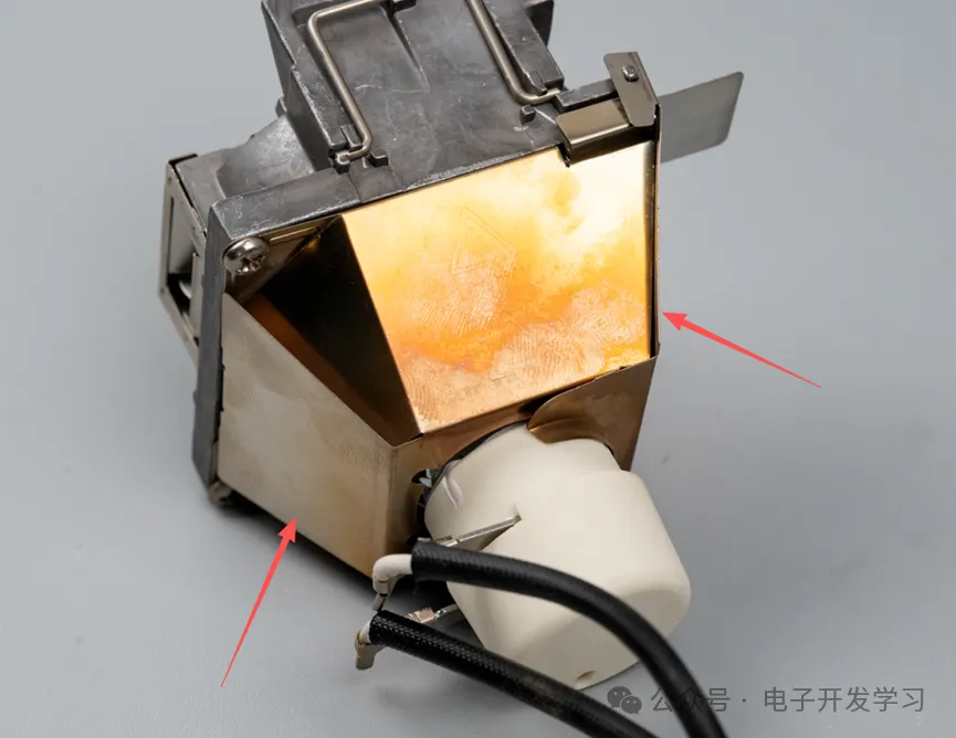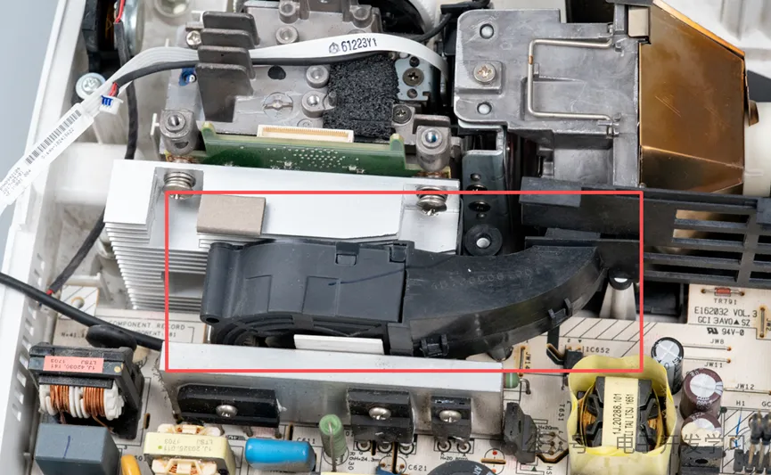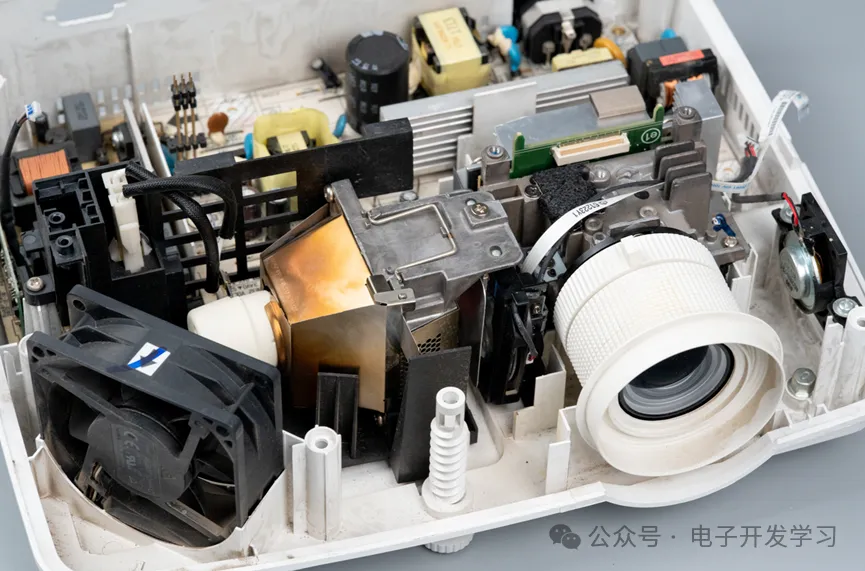 镜头后面的位置有一个风扇,风道导向了灯泡的散热器。实际上风经过这个灯泡之后,会从角落里那个风扇吹出去。