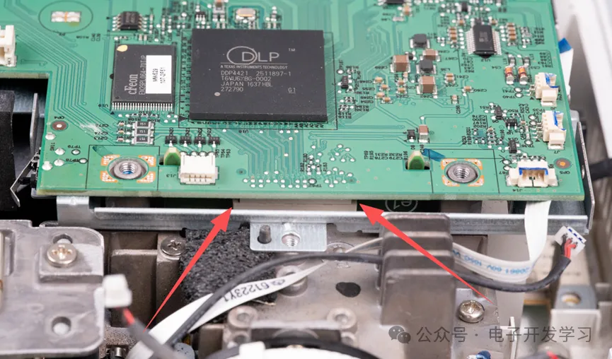 主板安装,注意有一个6胶排针要对齐。另外就是DMD微镜那个板子和主板之间是一个BTB连接器,需要对准。