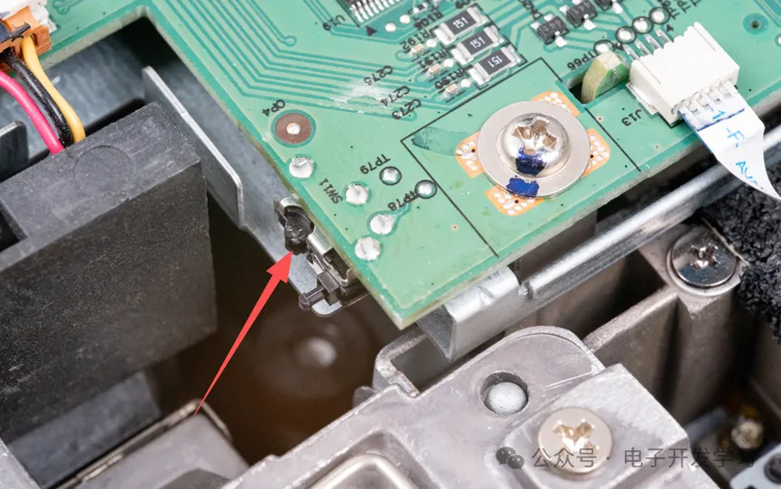 然后把盖子安装好,再次开机发现不能开机了。重新开盖,发现是这个微动开关的柄掉了,应该是安装上盖的时候那个结构碰到了,这玩意装上盖是个技术活啊。