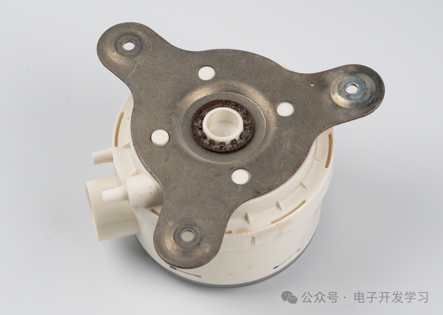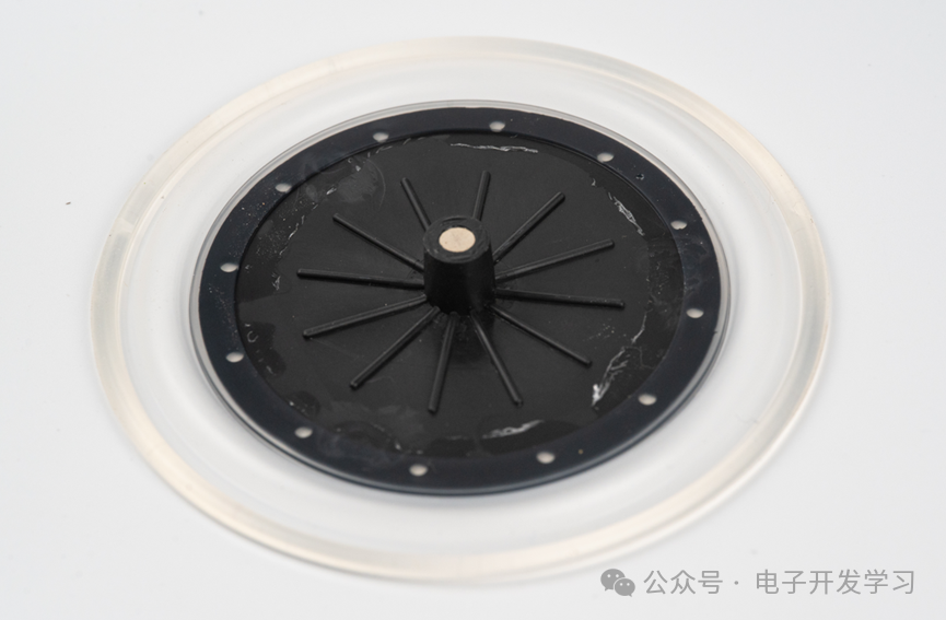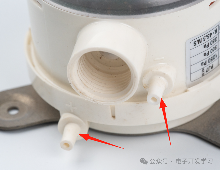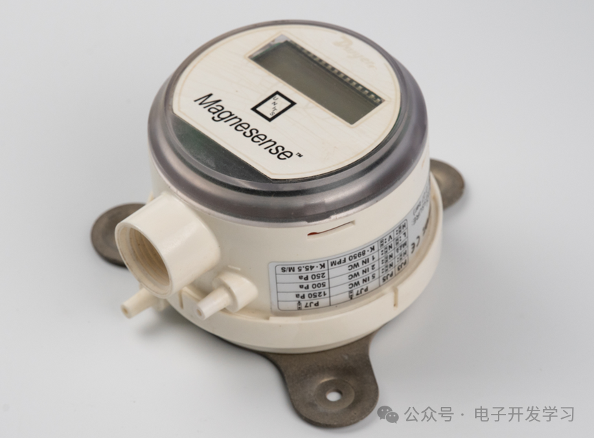 这样的话,大概就可以推测出这个变送器的检测原理:橡胶软垫两侧存在差压之后,会压到金属片上的小球,从而导致金属片弯曲,金属片弯曲之后,带动右端的塑料件上的磁铁位置改变,从而被霍尔传感器检测。通过这样的一个流程,就可以把差压转换为霍尔传感器的输出,再经过一些处理最终可以用来表征差压值。