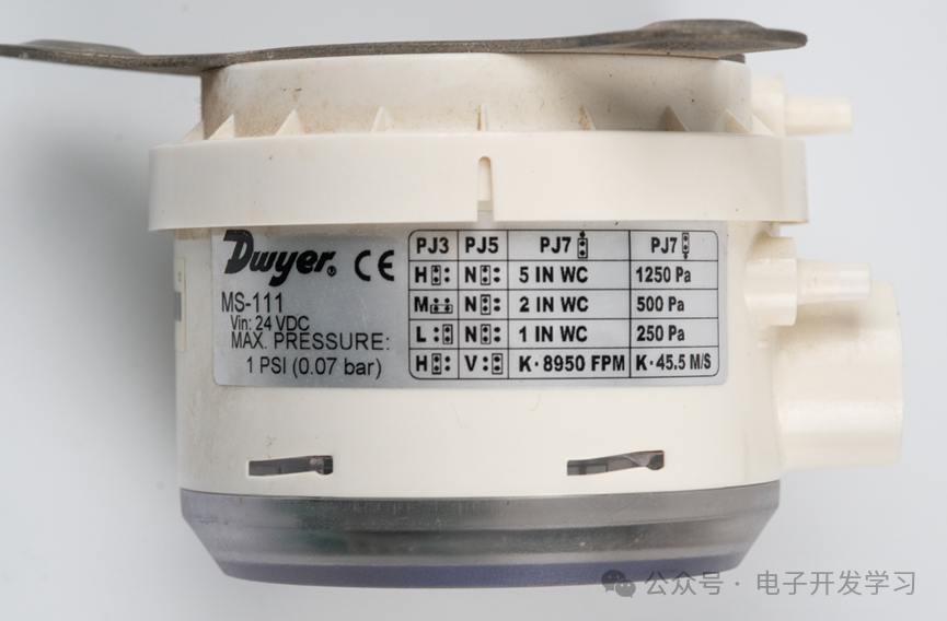 侧面看的比较清楚,这个差压变送器的型号是MS-111,供电24V,可测量的最高压力是0.07bar。右边的表格里说明了如何使用跳线来设置压力范围。