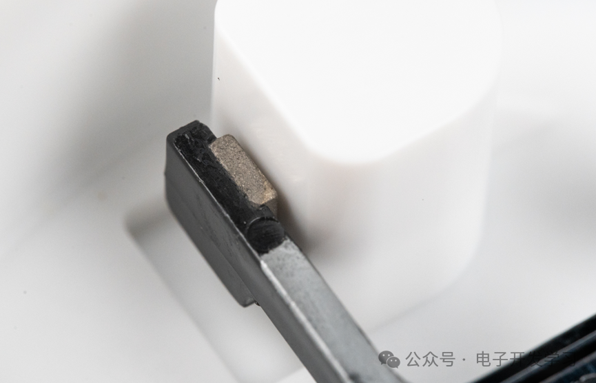 塑料件的右端上也是一个小磁铁。这个小磁铁旁边是一个塑料壳体生产出来的柱子。我猜测这个柱子里面应该是可以检测磁铁的霍尔传感器。