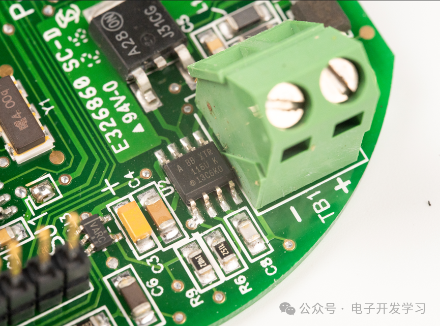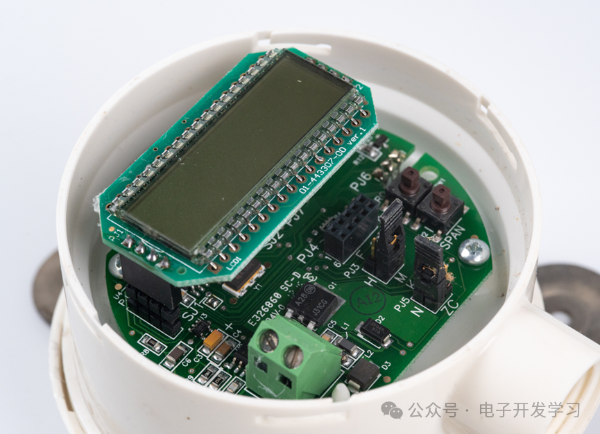 变送器输出端子。XTR115UA/2K5是来自Ti的4-20mA电流环路变送器芯片,所以这个变送器是电流输出型。