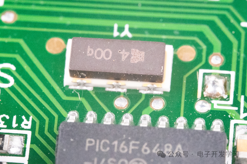 主控芯片使用的晶振频率4MHz,封装是这种3脚封装,没看到电容,看来这个晶振和村田的3213封装的3脚内置电容的晶振是一样的。