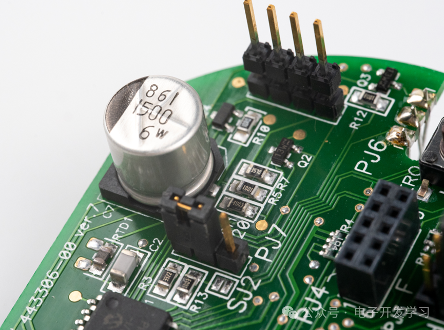 按键、跳线帽、还有旁边走线挺好玩的104排阻。