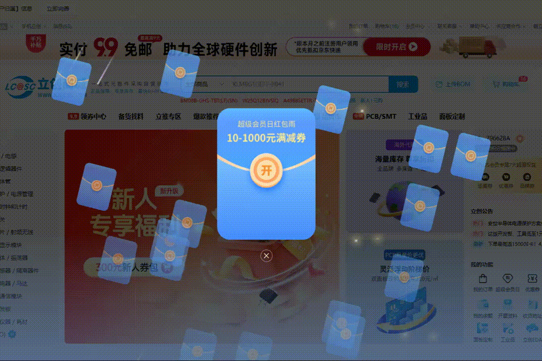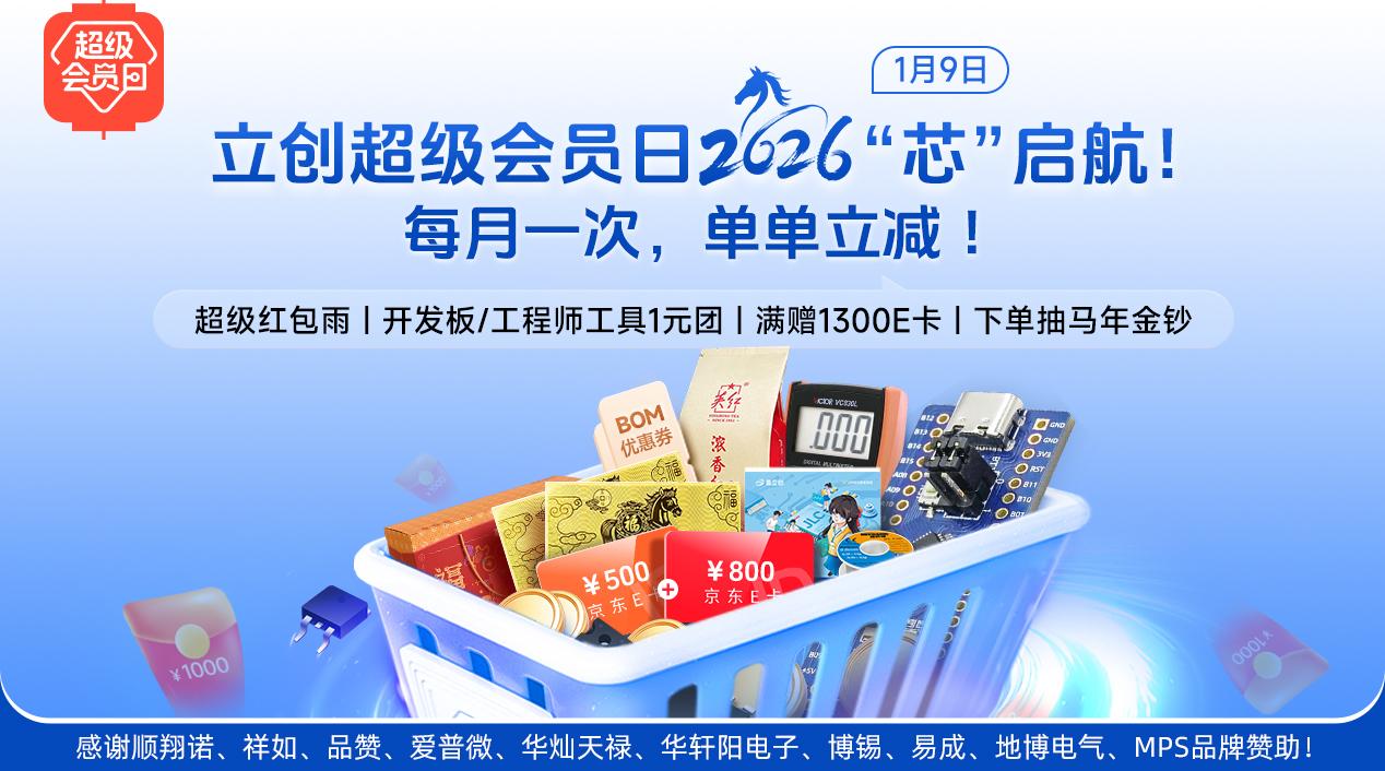 1月7~9日登录立创商城首页或前往超级会员日活动页,即可随机获得一张10~1000元元器件现货券,仅限超级会员日当天可用。