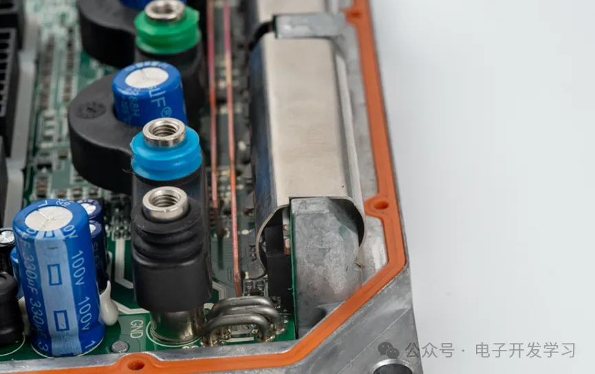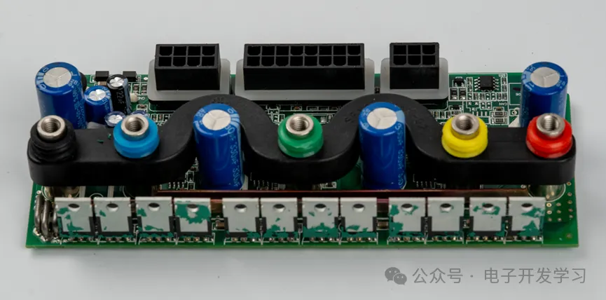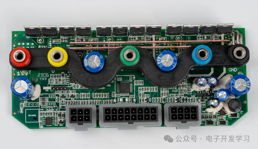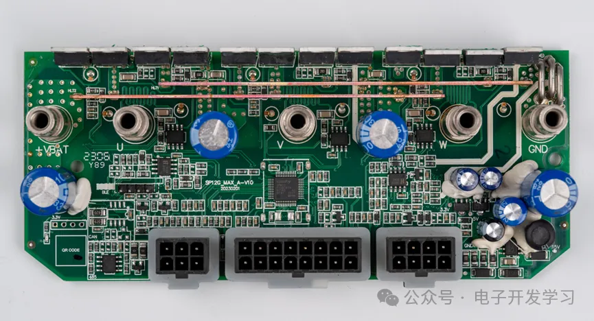 现在看板子正面。电池母线正负极和电机UVW相线端子使用一个黑色ABS套固定。最风骚的是这个ABS套在两个电容处来了一个秦王绕柱走。