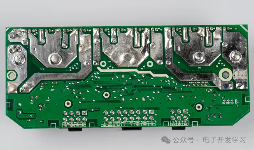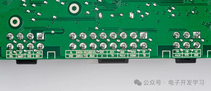 信号端子的功能都有丝印标注。板子背面能看到很多测试点,但是这些测试点焊接时都做了开窗上锡。