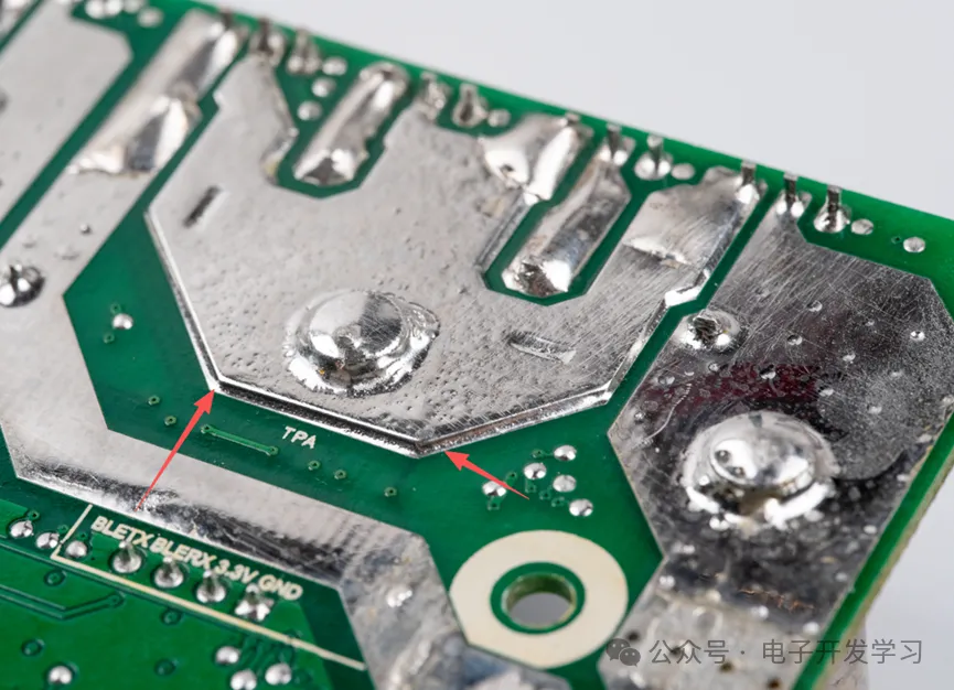 MOS管散热方案是通过两个钢卡扣卡在铝合金底壳的散热凸台上的。这个方案小马哥是第一次见,比较喜欢,因为拆解和组装都非常方便,而且卡起来很紧,看着也很简洁。